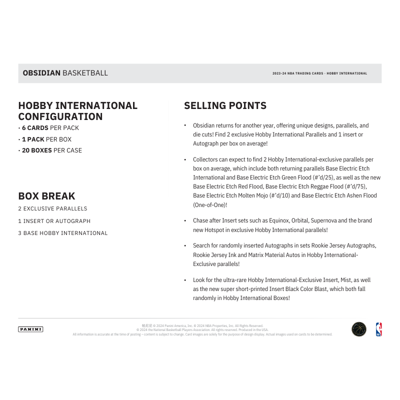 The 2023/24 Panini Obsidian Basketball International Hobby Box is a premium offering that stands out with its high-end content. This edition features a captivating array of NBA superstars, rookies, and legends, all showcased on etched cards. Each box includes a mix of base cards, electric parallels, and rare inserts, with the chance to find highly sought-after autographs and memorabilia cards.