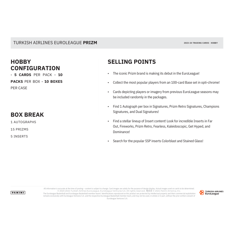 - Cards depicting players or imagery from previous EuroLeague seasons may be included randomly in the packages.
