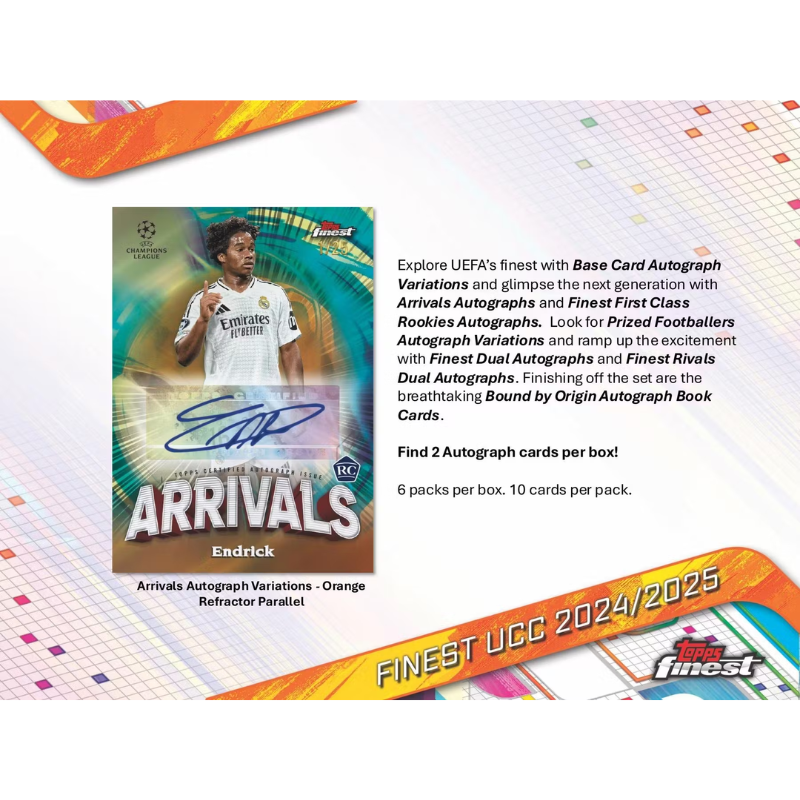 Uncover two Autograph Cards in each box, featuring superstars, rookies & legends. Look for the finest UEFA has to offer in Base Card Autograph Variations. Find the keys to the future with Arrivals Autographs and Finest First Class Rookies Autographs. We're continuing the tradition with Prized Footballers Autograph Variations and doubling down with Finest Dual Autographs and Finest Rivals Dual Autographs. The breathtaking Bound by Origin Auto Book Cards round out the set in style.