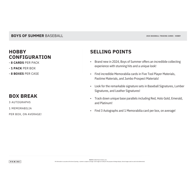 The 2024 Panini Boys of Summer Baseball Hobby Case is a must-have for collectors and baseball enthusiasts alike. This release captures the essence of America's pastime with an array of autographs, memorabilia, and exclusive inserts. Whether you're chasing the latest rookie sensation or adding to your collection of all-time greats, the 2024 Panini Boys of Summer Baseball Hobby Case delivers excitement and timeless appeal.