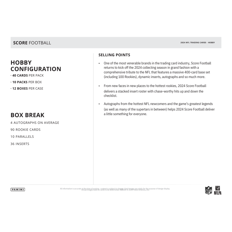 - One of the most venerable brands in the trading card industry, Score Football returns to kick off the 2024 collecting season in grand fashion with a comprehensive tribute to the NFL that features a massive 400-card base set (including 100 Rookies), dynamic inserts, autographs and so much more.